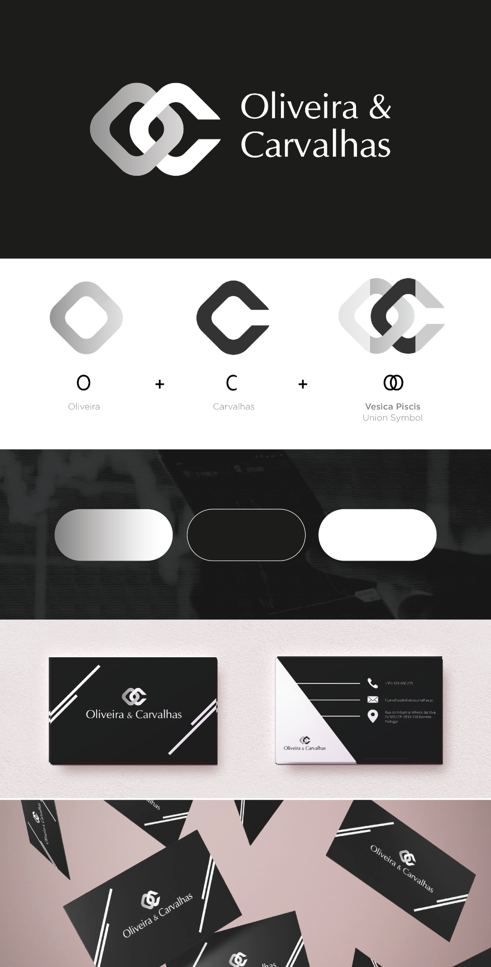 A construção do símbolo partiu da junção das iniciais O e C, exploradas através de formas geométricas simplificadas. A interseção entre ambas inspira-se no conceito da Vesica Piscis, um símbolo ancestral associado à união, equilíbrio e colaboração — elementos que representam a relação entre os dois nomes e a própria missão da empresa. O resultado é um monograma moderno, estável e versátil, capaz de funcionar tanto isoladamente como integrado no conjunto tipográfico.
