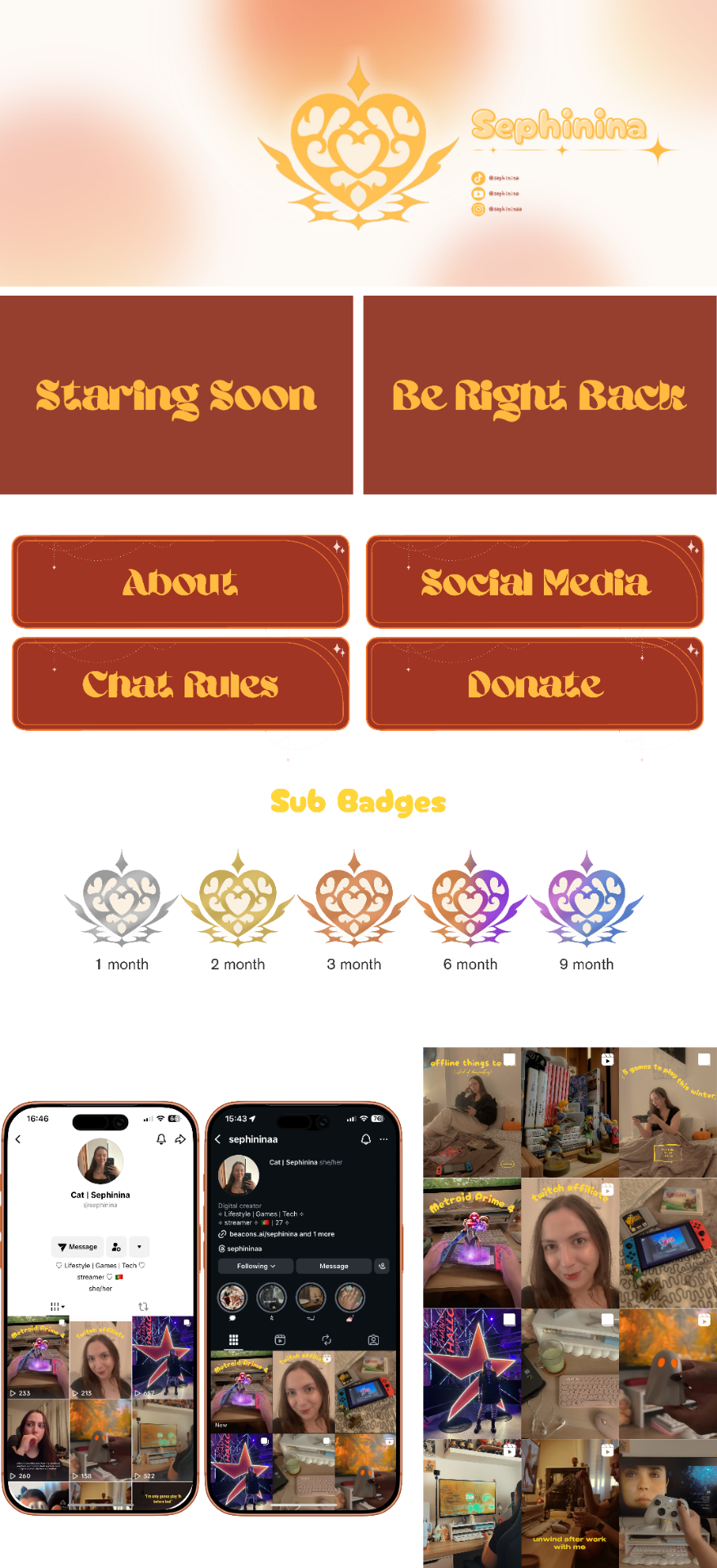 Para este projeto, desenvolvemos toda a identidade visual da marca, desde o logótipo e grafismos até aos painéis de stream e badges de subscrição. O objetivo foi criar um universo visual acolhedor, inspirado em tons quentes e elementos fantasy, que refletisse a personalidade cozy e divertida da criadora.
